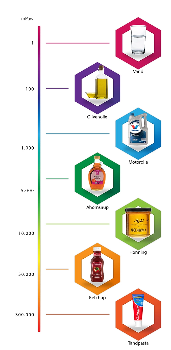 Nedenfor kan du se en række eksempler på kendte medier og deres viskositet. Eksempelt starter ved vand, som har en viskositet på 1 mPa·s.
